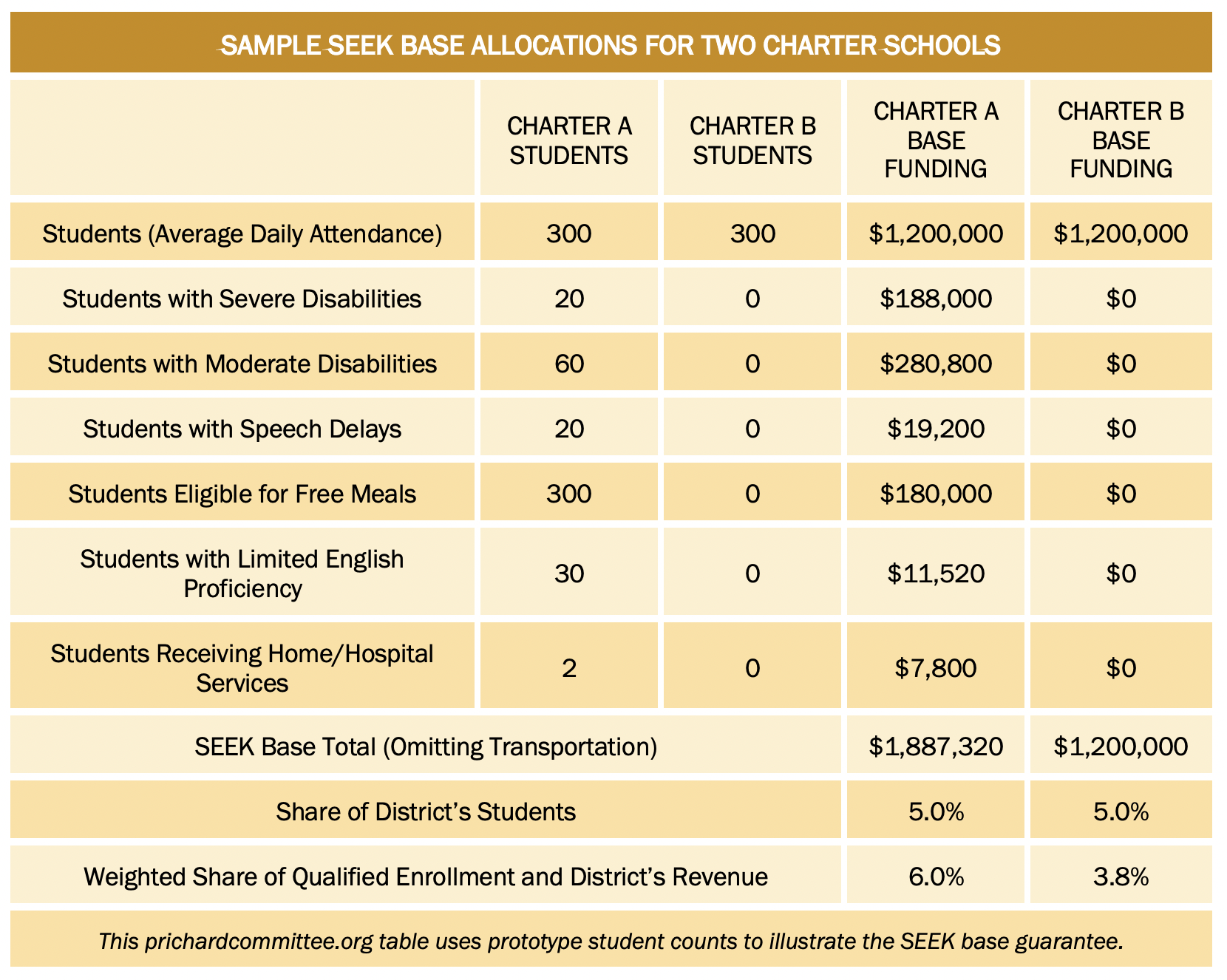 KRS 157.360 is the statute that sets up the base part of the SEEK formula, so here’s my prototype of that step for two imaginary charter schools. These schools have matching numbers of total students but quite different student needs. Like the district numbers above, it begins with total students in average daily attendance and follows with the add-on amounts that go with the current $4,000 base guarantee.