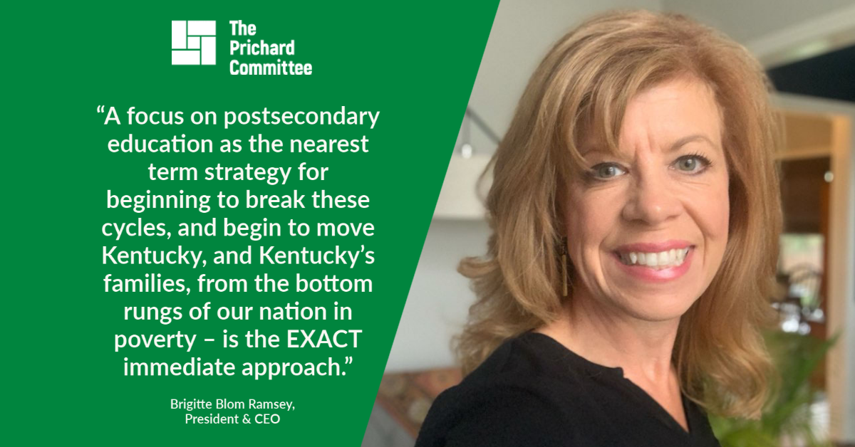 The depth of poverty and our improvements in education are inextricably linked. We know education can break the cycle of poverty – if a degree or certificate is meaningful in the marketplace and there is a marketplace in which to utilize one’s skills and abilities. In Kentucky, we must focus on both – from the west to the east, the north to the south: preparing our people through education and ensuring our approach to economic development allows an individual to secure a job with a family sustaining wage and the ability to build wealth over time. A focus on postsecondary education as the nearest term strategy for beginning to break these cycles, and begin to move Kentucky, and Kentucky’s families, from the bottom rungs of our nation in poverty – is the EXACT immediate approach.