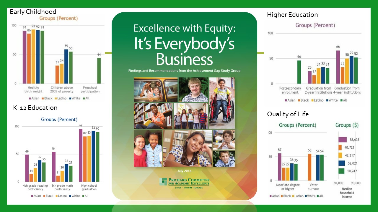 To truly make these improvements – at the state and local level – a targeted and intentional approach to various groups of individuals in our state is necessary. The first step is knowing how different groups are doing. In fact, we must approach all of this work through the lens of excellence with equity if we are to ensure we deliver for Kentucky’s families, Kentucky’s communities, and the growth of our state as a whole.