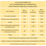 At KCTCS, there were no fields that reached 10.6%. STEM was again the area where Black graduates were least represented, though Health did better. In education, there were too few Black graduates for public reporting.