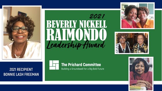 LEXINGTON, Ky. – Bonnie Lash Freeman, a Jefferson County education champion described as “believing in the power of parents,” is the recipient of the 2021 Beverly Nickell Raimondo Leadership Award from the Prichard Committee for Academic Excellence.
