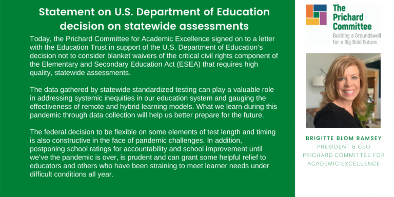 LEXINGTON, KY – Today, the Prichard Committee for Academic Excellence signed on to a letter with the Education Trust in support of the U.S. Department of Education’s decision not to consider blanket waivers of the critical civil rights component of the Elementary and Secondary Education Act (ESEA) that requires high quality, statewide assessments.