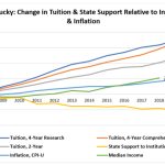 From 2008 through 2020, Kentucky’s state support to public colleges and universities declined 21%, or over $220 million.  During the same period, tuition costs increased 51% at public 2-year colleges, 71% at public 4-year regional campuses, and 73% at public 4-year research campuses.