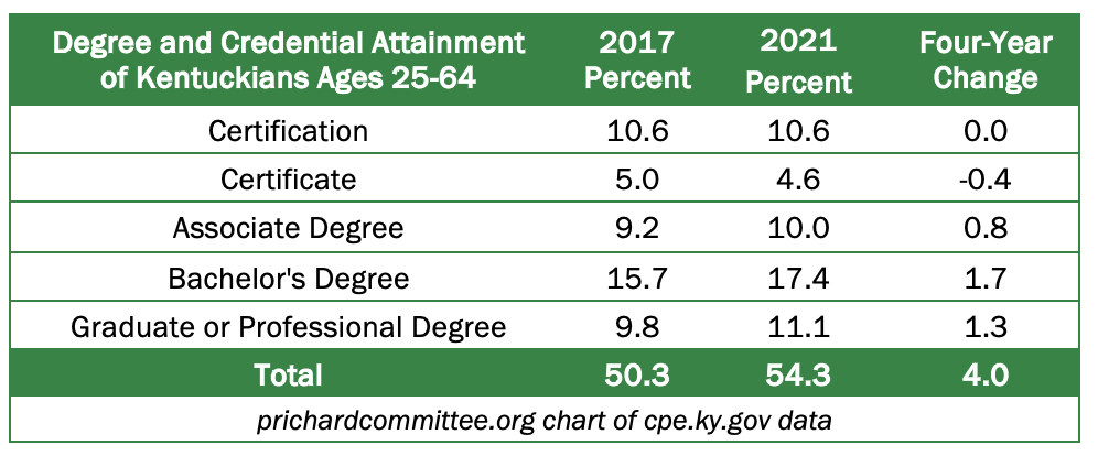 In 2021, 54.3% of Kentucky residents ages 25-64 held postsecondary credentials, including certificates, certifications, associates and bachelor degrees, and graduate/professional degrees. That puts us on a good track for CPE’s ambitious goal: 60% postsecondary attainment among Kentuckians ages 25-64 by the year 2030. This is a bright spot to celebrate.