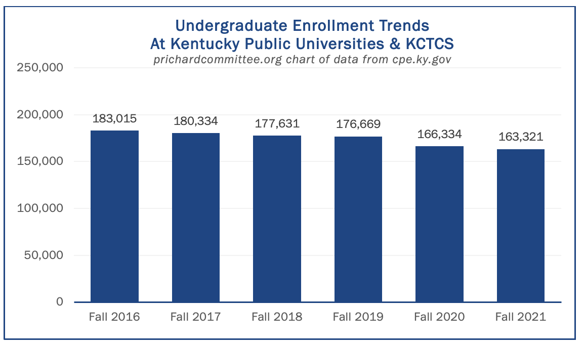 Fall 2021 undergraduate enrollment in Kentucky public universities and KCTCS was 11% lower than Fall 2016. That’s a major storm cloud threatening our ability to keep up the attainment progress noted above. It’s a trend to see, study, and work to change.