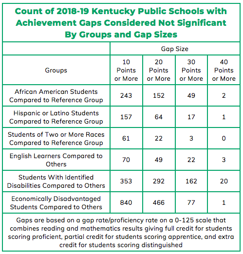 These gaps are based on a score that combines reading and math data on a zero to 125 scale, with full credit for proficient scores, half credit for apprentice results, and extra credit for distinguished work. Some parts of Kentucky school report cards call that number the proficiency indicator score, while others call it the gap rate, but it’s the same calculation.