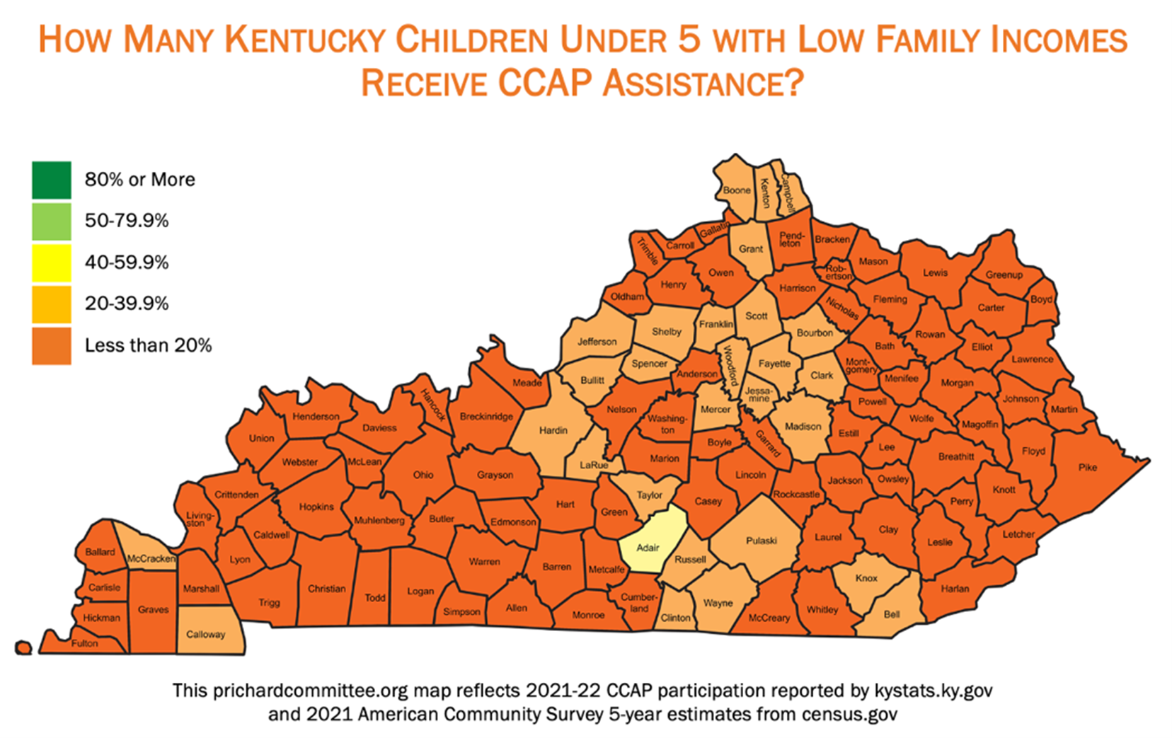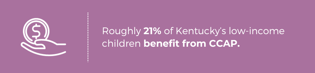 In 2021-22, about 21,000 children benefited from CCAP, the program designed to support care for low-income children and workforce participation for their parents. That’s out out of more than 125,000 chlidren with incomes below 200% of poverty. It’s an important improvement over 21,000 a year earlier, but it’s still alarmingly low. Roughly, about 21% of Kentucky’s low-income children benefit from CCAP.