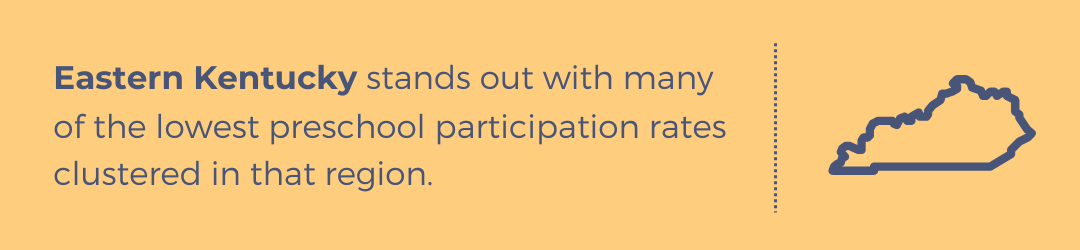 Mapping by counties, Jefferson, Fayette, Northern Kentucky, and nearby areas have lower preschool rates than most counties shown, and the strongest participation levels are mostly to the south. Their child care strength and preschool weakness may be connected., perhaps because many parents are choosing year-round care over school-year-only preschool. However, Eastern Kentucky stands out with many of the lowest preschool participation rates clustered in that region.
