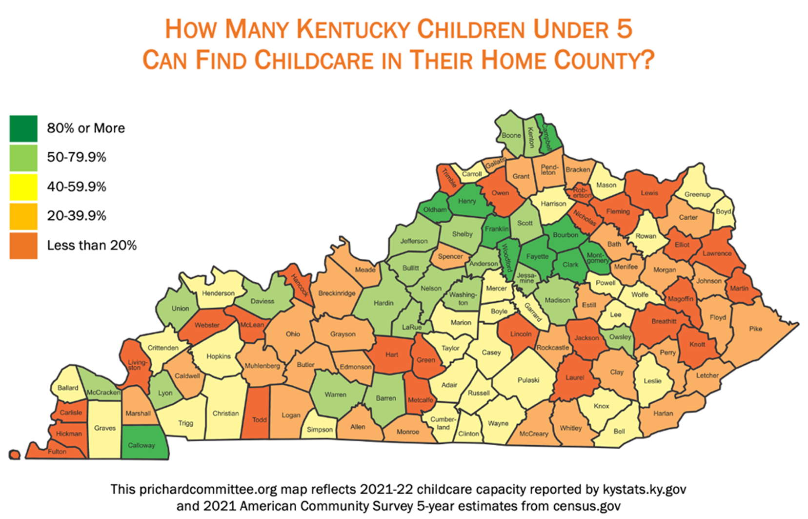 Here, every county shown in yellow, light orange, and darker orange is below that 61% statewide level. In nearly every eastern county, families face higher challenges finding care. Families in and near Jefferson, Fayette, Warren and Northern Kentucky may find it at least a little easier.