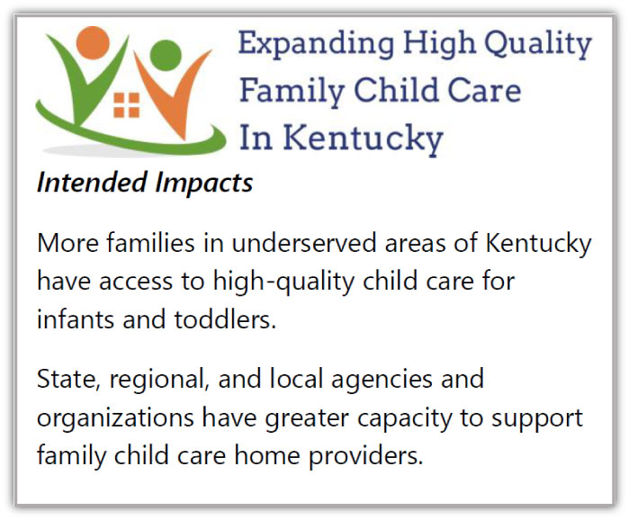 The Expanding High-Quality Family Child Care Homes in Kentucky project will continue through April 2021. With regional pilot teams active, the next phase of learning will come through finding out what approaches do, and do not, work to recruit more family child care home providers for infant and toddler care and support them in providing high-quality learning environments.