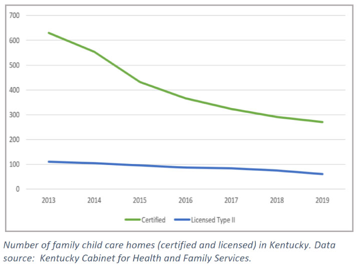 Their challenges have grown even more acute. Even before the COVID-19 public health crisis disrupted the child care landscape (see Kentucky Child Care Provider Survey), child care centers across Kentucky were limiting enrollment due to challenges finding qualified employees. Far fewer Kentuckians were providing child care in their homes as a family child care provider – those who meet state standards for safety, health, and quality.