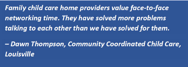 The pilot team in Louisville, led by the Ready for K Alliance and Community Coordinated Child Care, focuses on recruitment and support of Spanish-speaking family child care home providers. It started by creating a community of practice among current providers and is now building a formal network for providers. DCC has translated numerous documents into Spanish to support the team’s efforts. The team has several early lessons. One is that in network-building among specific populations of providers, it is critical to understand and respond to cultural variation within the population. Another is that working with individuals with credibility and trust in the community is essential.