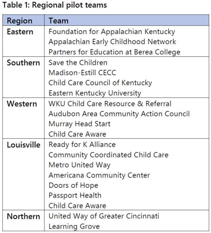 With grant funding from the project and local matching funding, leadership teams in five regions across Kentucky (see Table 1) have come together to pilot new approaches to increase access to high-quality child care for infants and toddlers and support family child care homes.