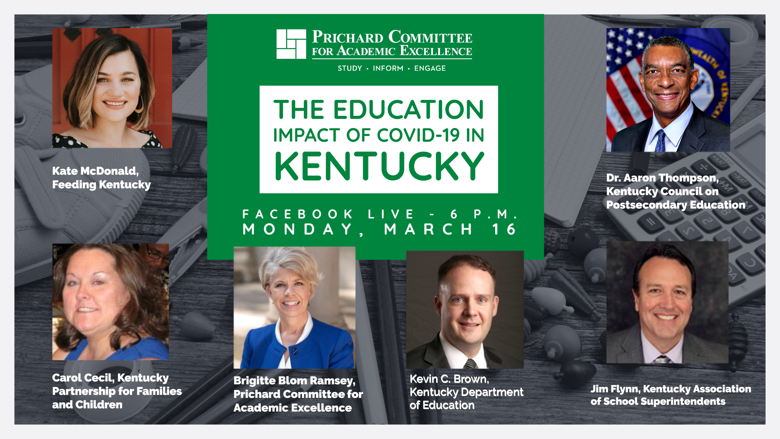 On Monday, March 16, the Prichard Committee for Academic Excellence hosted a Facebook Live conversation about the education impact of COVID-19. Prichard Committee President and CEO Brigitte Blom Ramsey facilitated a discussion on the impact of closures in all levels of education daycare, K-12 schools, colleges and universities.